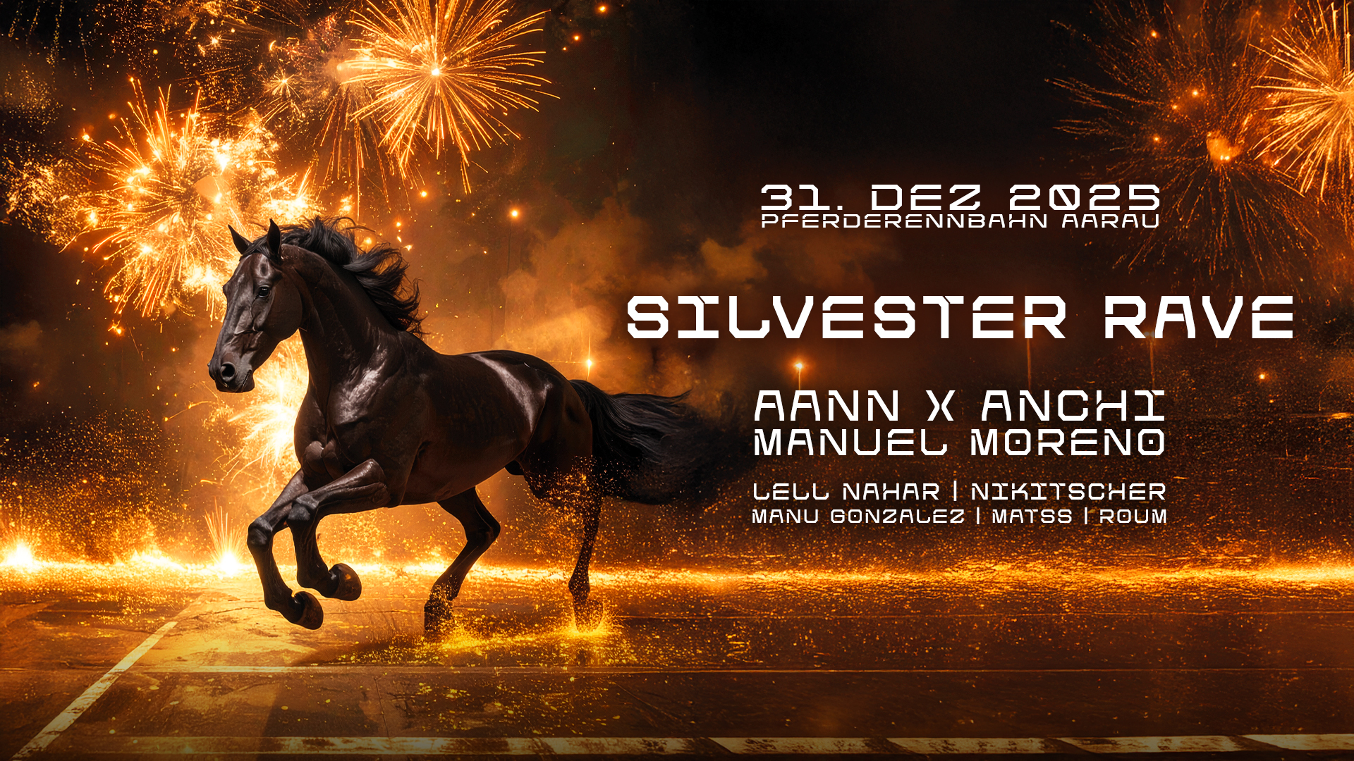 Wir feiern am 31.12.2025 auf dem Areal der Pferderennbahn in Aarau Silvester! Bist du dabei? Wir freuen uns riesig auf euch!